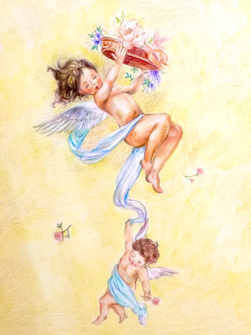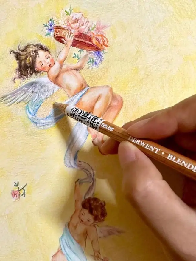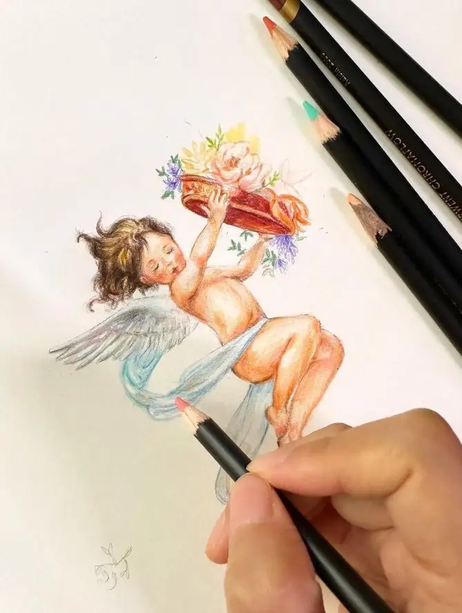 색연필을 사용할 때는 오일파스텔과 달리 세밀한 표현을 할 수 있어서 작고 귀여운 천사들을