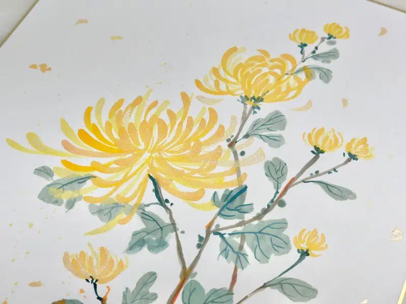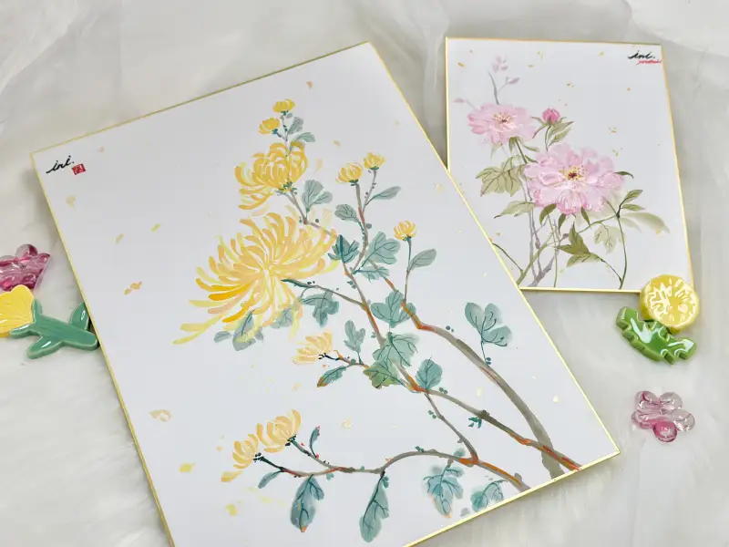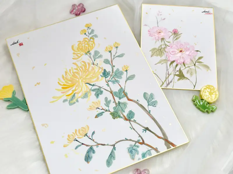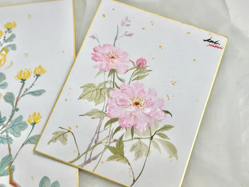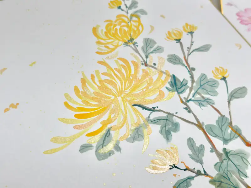 3. 길상의 두방지 테두리엔 고급스러운 금테까지 둘러져있어서 선물하기에도 딱인 것 같아요! 종이가 물에 반응하며 부풀어오르고 젖은 느낌이 드는 느낌이 아주 독특하고 매력적이었습니다. 물얼룩이 더 잘보이니 농담조절이 더 풍부하게 보일수 있겠다 생각했어요. (스며드는너낌이랄까요) 수채지에 사용할 때랑은 전혀 다른 느낌이더라구요. 동양화는 스케치를 먹지를 대고 본을 떠서 한다고 들었는데 저는 알못이므로 스케치는 하지 않았어요(붓으로 쓱쓱 그려보고도 싶었고, 약간 번진다면 스케치 선을 삐져나가면 더 불편할 것 같았어요)