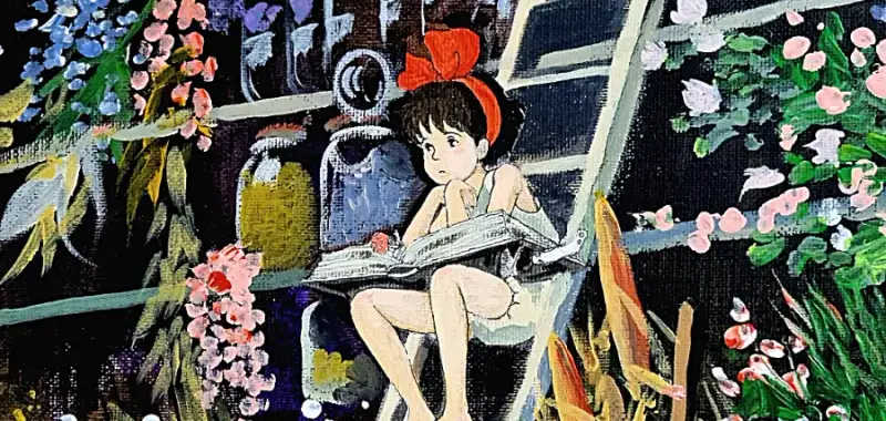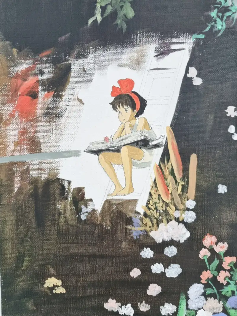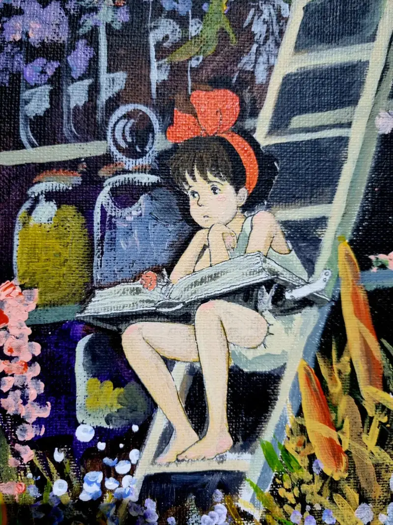 꽃과 식물이 가득한 어두운 창고에서 사색에 잠긴 마녀배달부 키키를 그리기로!