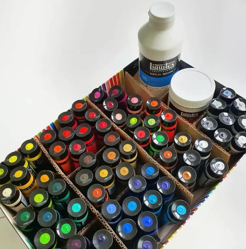 문제는 패키지 구조가... 정말 편의성이 낮았어요ㅠ 박스 안에 플라스틱 지지대만으로 꽉꽉 들어 있어서 사용할 때 다 꺼내서 펼쳐둬야만 했죠. 그래서 박스를 개조했어요(?) 귀차니즘이 심해서 물감 색상확인은 뚜껑에 바로 콕 찍어줬고, 한 면을 잘라낸 박스에 칸막이와 함께 쏙쏙 넣어주니 한눈에 확인이 가능해서 개조 대성공이었답니다🔥(추천!)