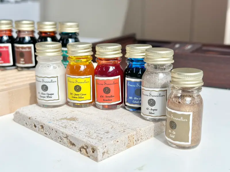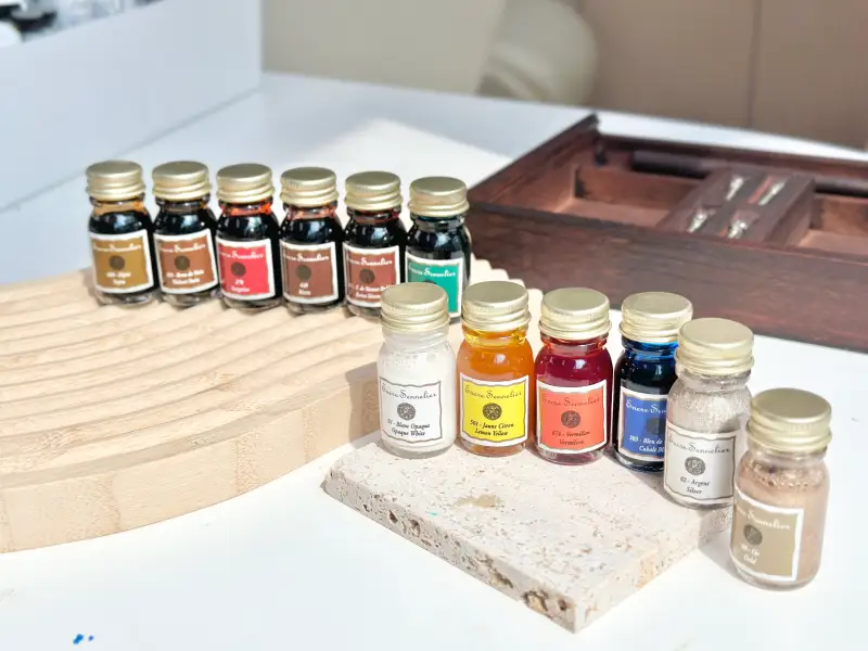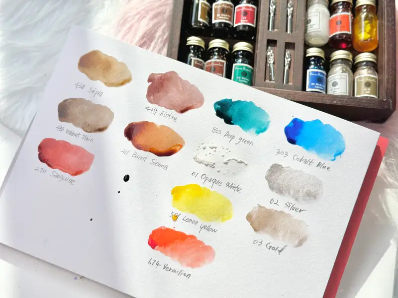 컬러는 sepia, walnut stain, sanguine, bistro, burnt Sienna, deep green, opaque white, lemon yellow, vermillion, cobalt blue, silver, gold 이렇게 총 12색이에요