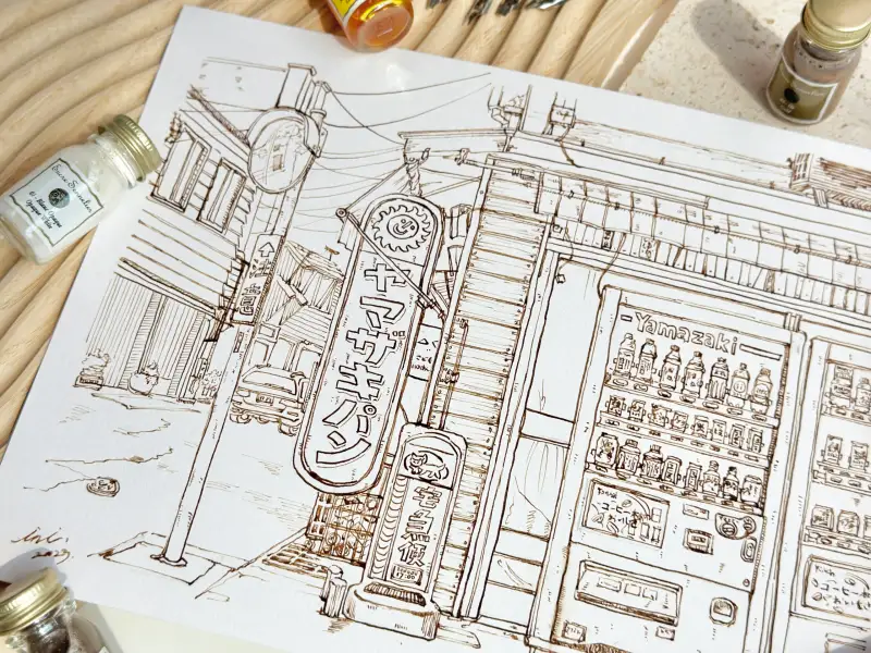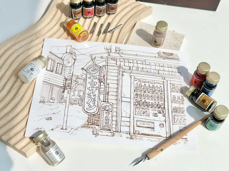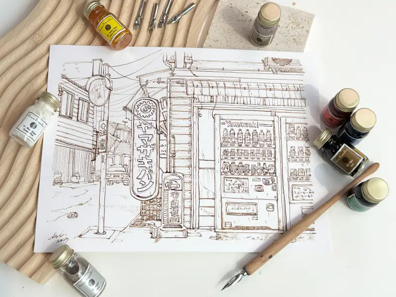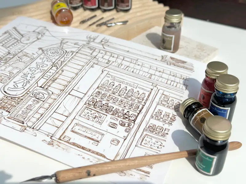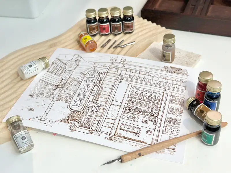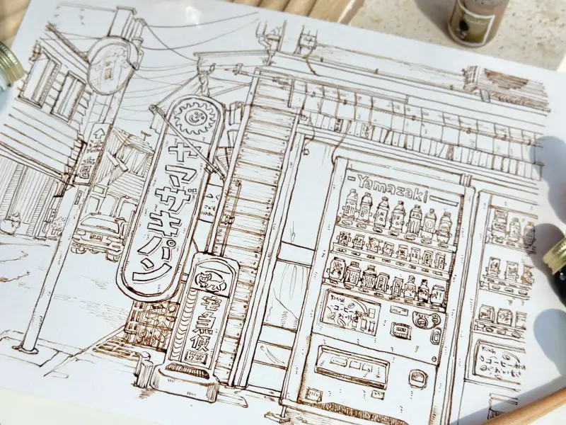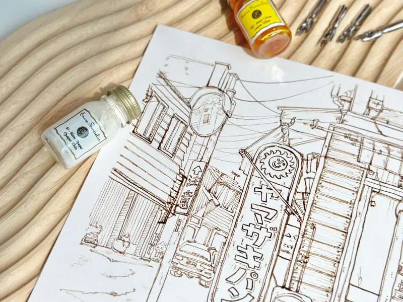 얇은 선이 많이 중첩된 어반스케치가 하고싶어서 타치가와 마루펜촉을 썼어요!