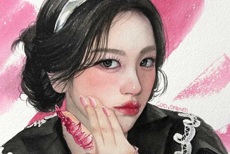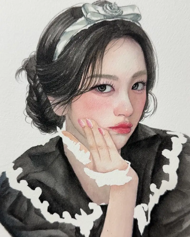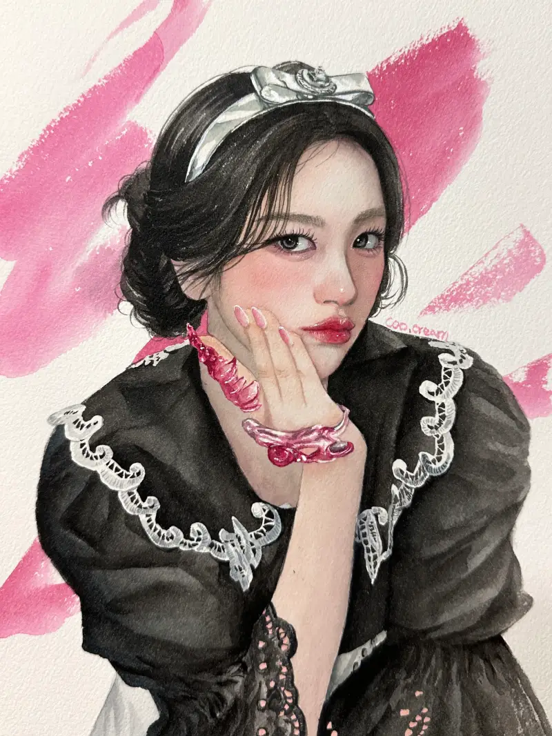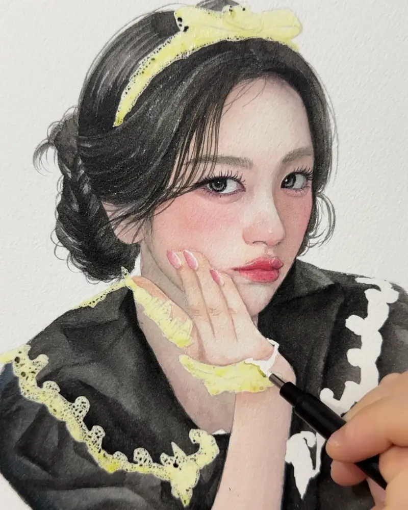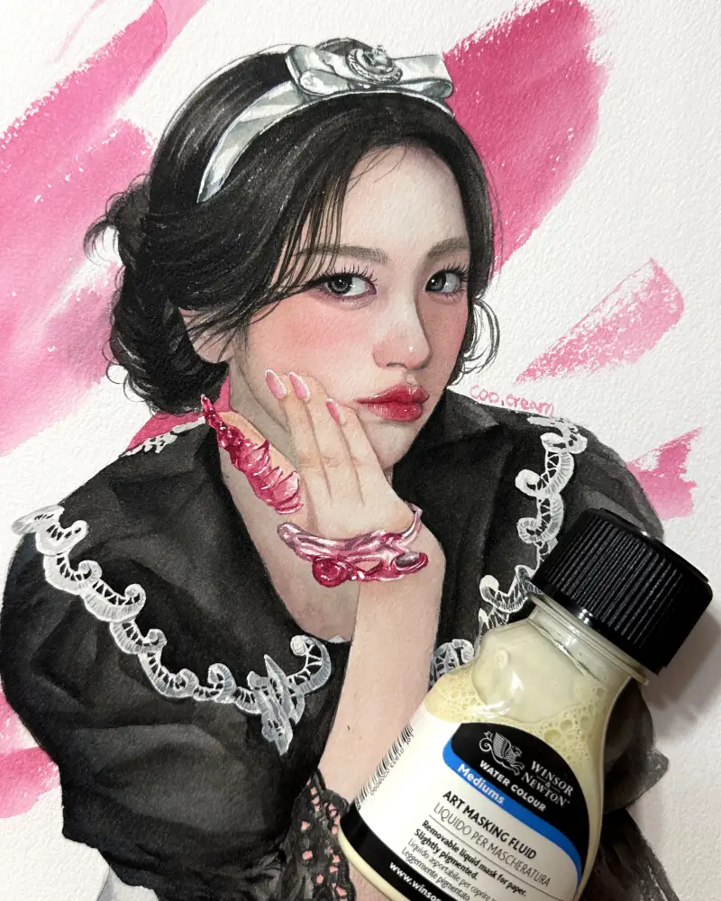이번 그림에선 머리띠, 옷, 손 장식에 마스킹액을 사용해봤어요. 피해서 칠 할 수도 있지만 신경을 많이 써야하고 시간도 많이 소모되죠🫠