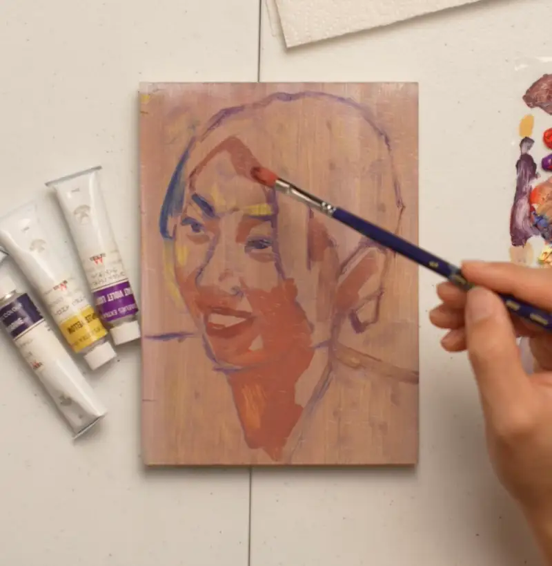 젯소를 칠해놓은 손바닥만한 크기의 나무판에 그림을 그렸어요. 주조색이 될만한 색으로 밑색을 깔아주고 간단하게 스케치를 해줬습니다.