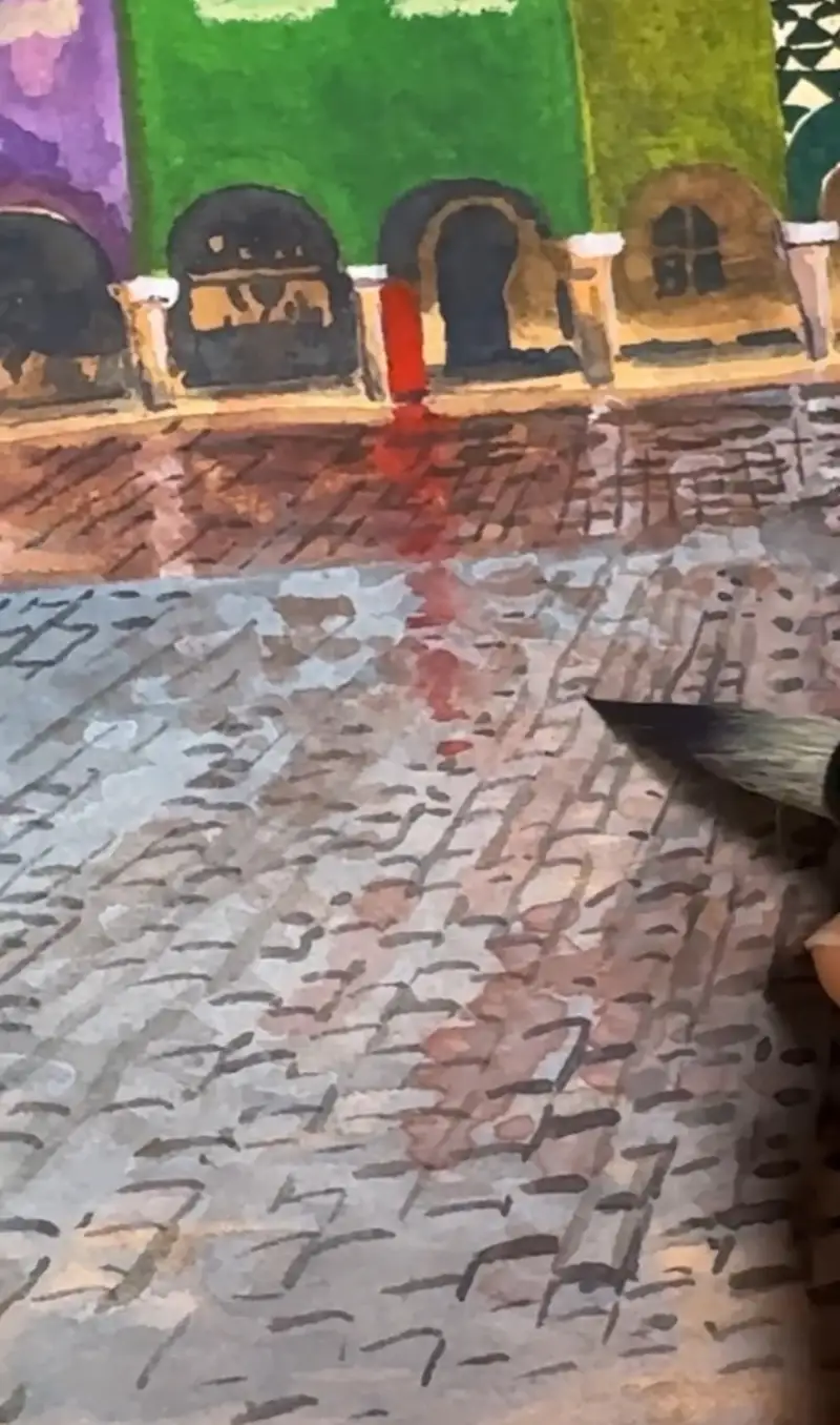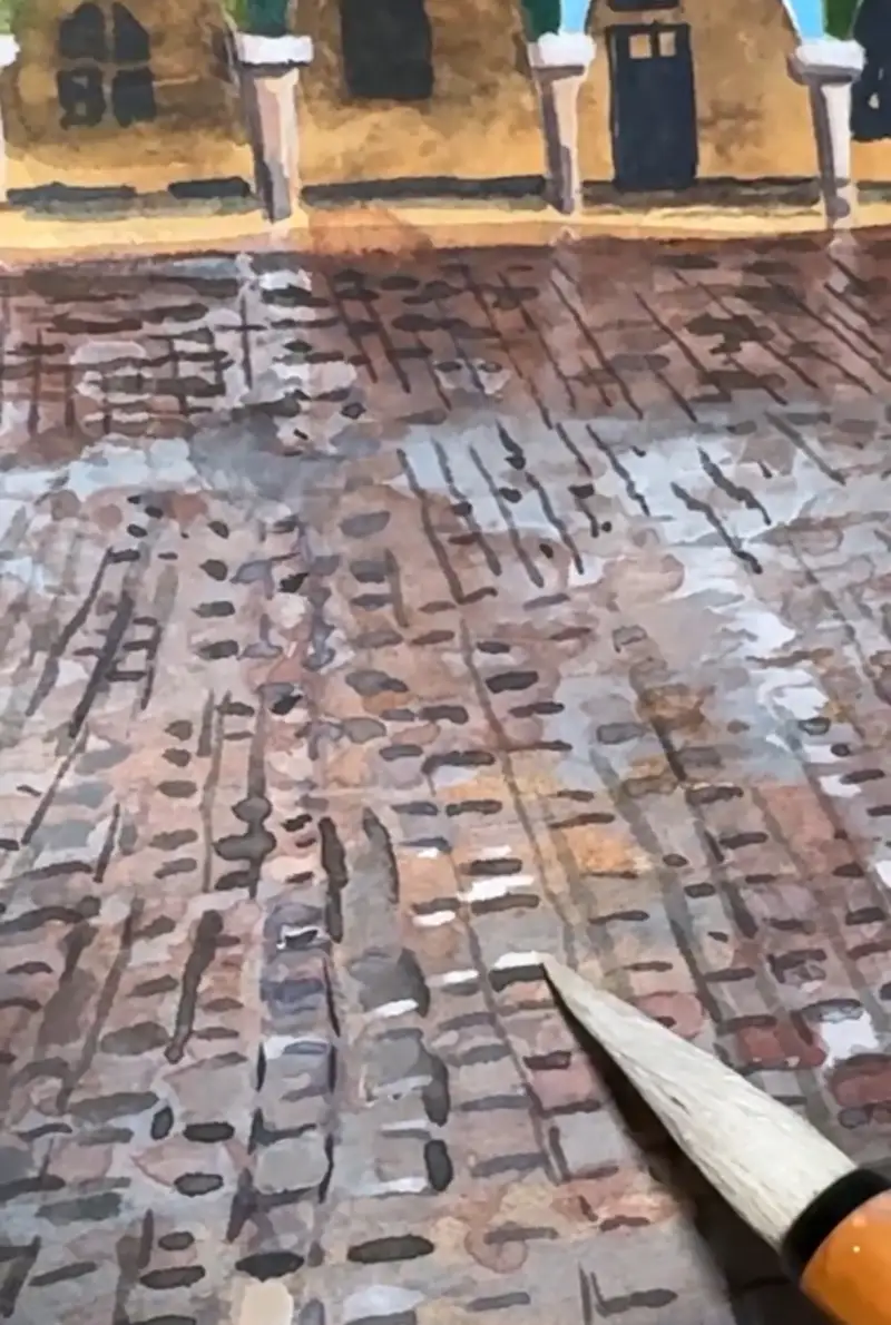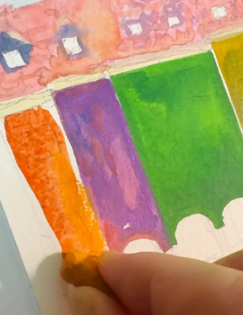 과슈는 은폐력이 강하고 재질감이 있어서 수채크레용과 잘 어울립니다. 수채 크레용을 같이 사용해서 오래된 돌 느낌의