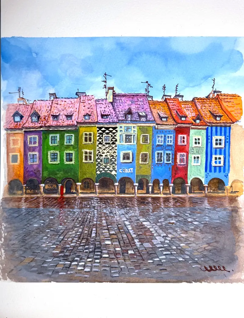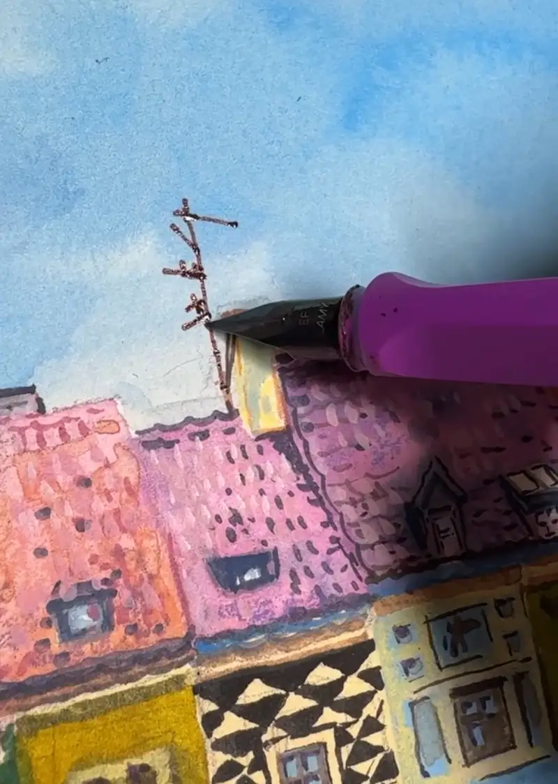 물감이 마른 후 펜으로 지붕의 그림자를 라인으로 그려줍니다.