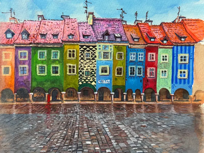 비에 젖어 반사되는 광장의 바닥을 표현합니다.
