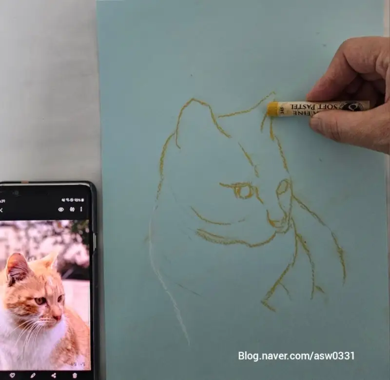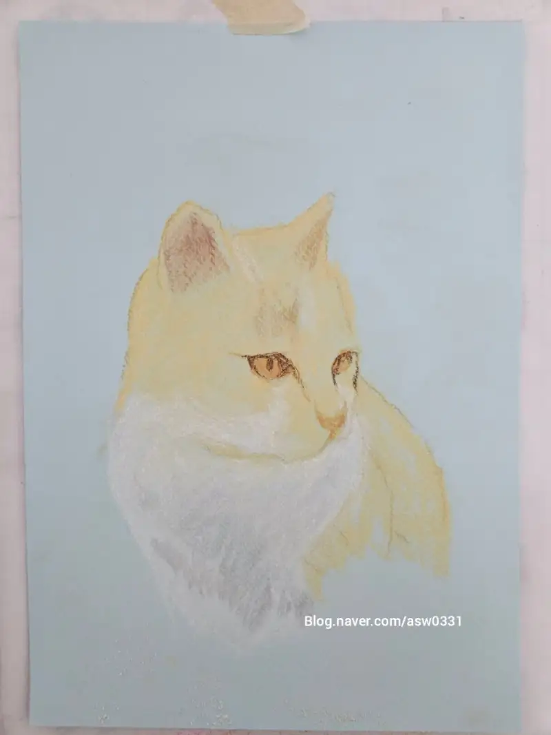 지인의 귀여운 고양이 '꾸꾸'를 머메이드지 하늘색 종이에 그려보겠습니다.
