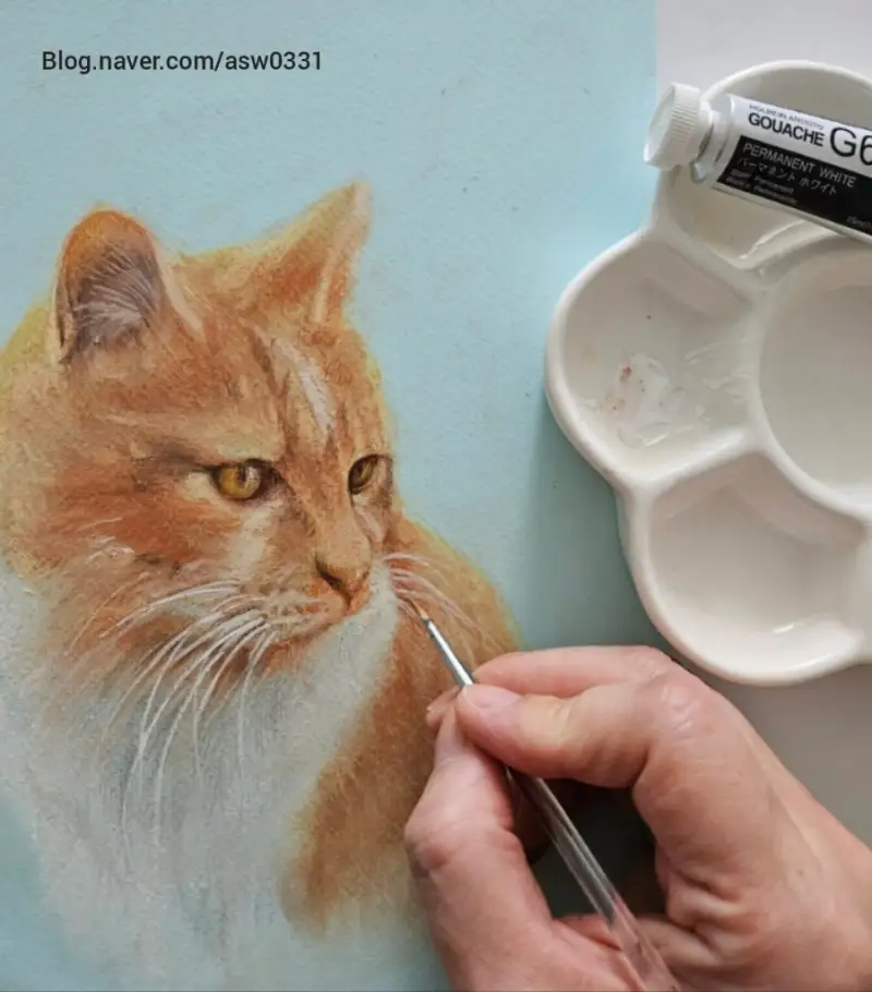 꾸꾸의 귀여운 수염은 흰색 파스텔이 효과가 미비해 다시 과슈로 덧그려줬어요.