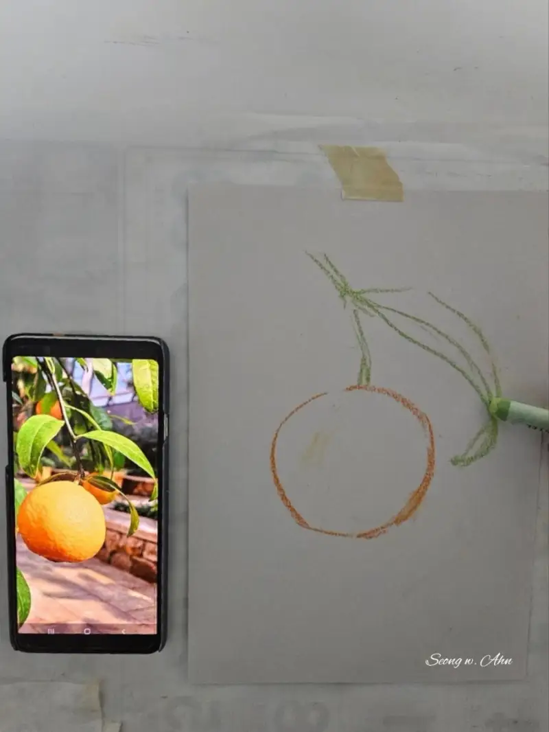 이번에는 식물도 그려보고 싶어서 회색 머메이드지에 나무에 달린 귤을 그려보려구요.