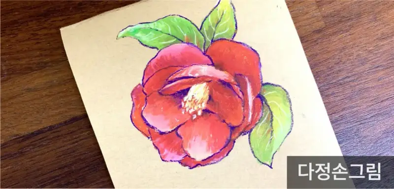 보색계열을 이용해서 러프하게 라인도 그렸더니 더욱 강렬한 느낌의 동백꽃이 되었어요.