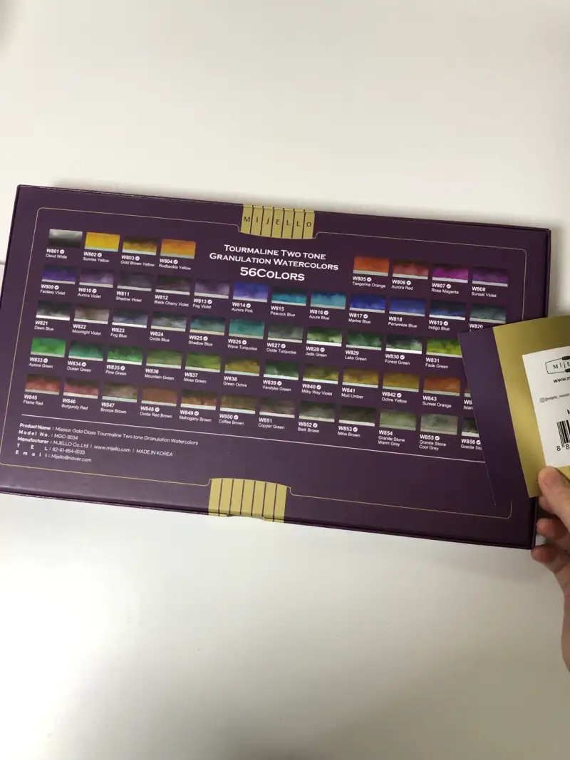 34색 세트 상자 뒷면에서도 총 56색의 컬러들을 살펴보실 수 있답니다. 미젤로의 과슈 상자와도
