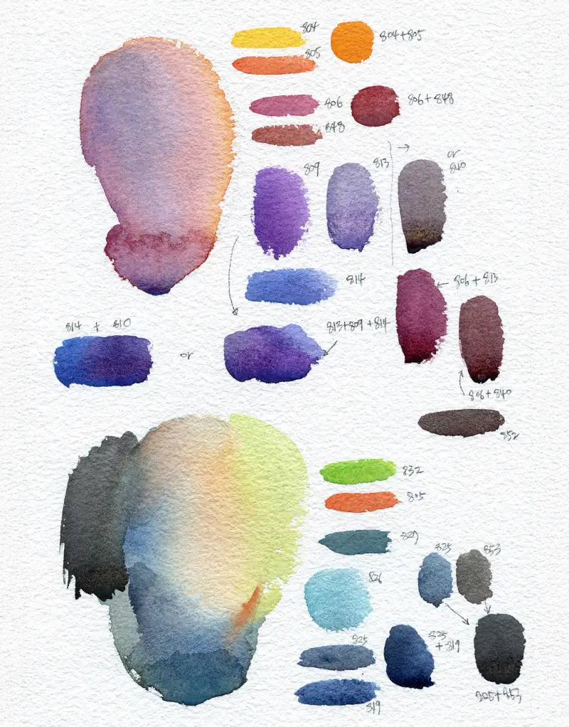 두 번째 발색표에서는 미젤로의 독특한 컬러들을 섞어 조합해 보았습니다. 그림을 그리기 전에