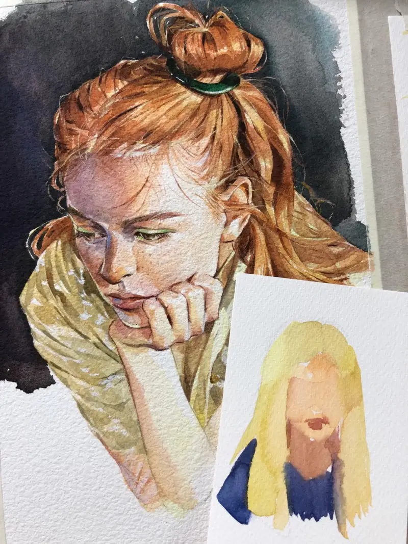 그림을 그리면서 황목 종이와 중목(파브리아노)을 비교한 모습입니다.