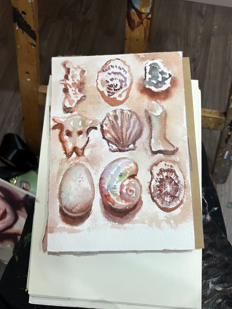 저는 최근에 바닷가에 다녀와서 그때의 기억을 떠올리며 바닷가로 떠밀려온 조개나 산호조각 같은 것들을 생각했습니다. 코튼 수채화의 도톰한 결이 농도에 따라 다르게 드러나서 모래나 바닷가의 파도 질감과도 잘 어울릴 것 같습니다.