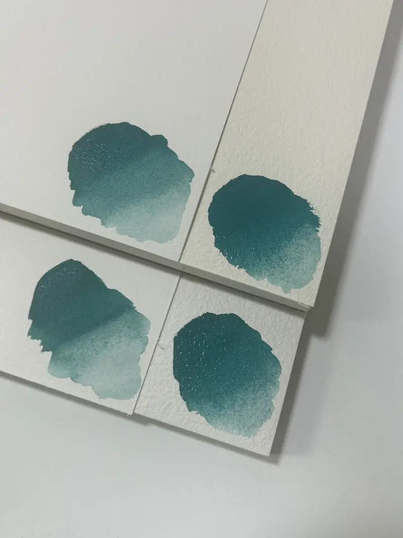 종이별로 같은 컬러의 물감으로 비교샷도 찍어봤어요. 이번 리뷰에 메인으로 사용한 아티스트 중목 용지는 미색이어서 그런지 물감 색도 좀 더 진하게 느껴지는 것 같아요. 또, 전체적으로 종이의 요철이 좀 진해서 물감 작업을 할 때 갈필 현상이 조금 있지만 그만큼 질감이 실감나게 살아나는 특징이 있어요.