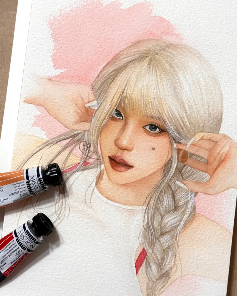 과슈는 제가 기존에 사용하던 수채물감처럼 발색력이 정말 정말 좋았어요. 저는 수채화 팔레트에 굳혀서 사용했는데, 물감이 물에 잘 녹아서 인물화를 그릴 땐 소량만 사용해도 충분하더라구요. 이번 그림은 수채화 종이에 그렸기 때문에 물을 타서 맑게 그려봤어요. 두껍게 얹어가며 작업하는 그림에도 수채화처럼 맑은 그림에도 사용이 가능해서 범용성이 높다고 생각했습니다💗