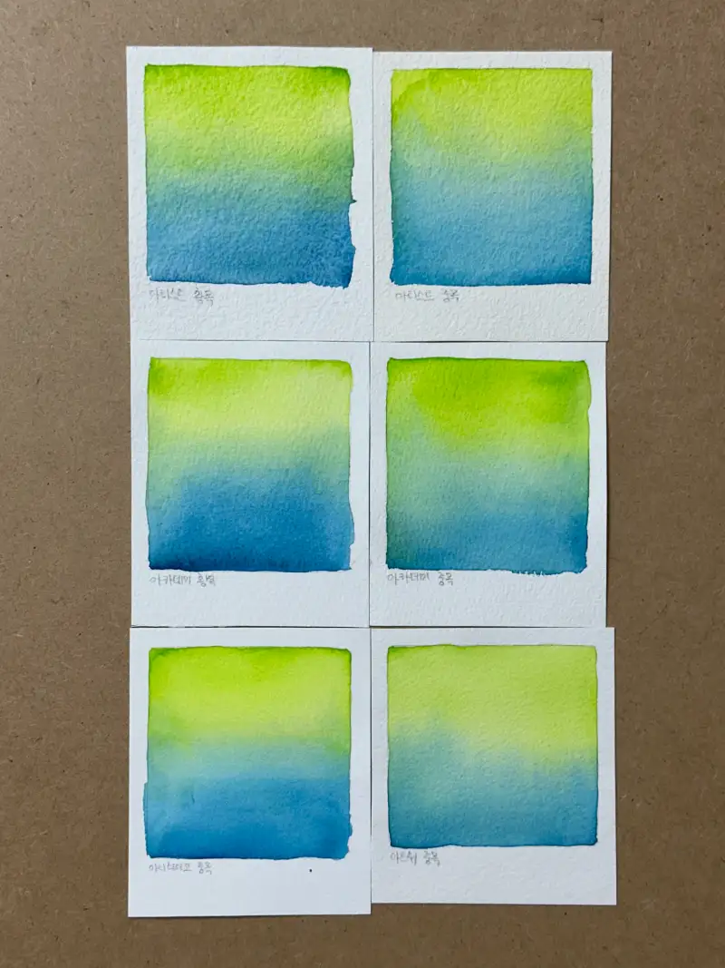 사용하자마자 가격대비 정말 퀄리티 좋은 종이라는 생각이 들었어요. 아티스트와 아카데미 모두 코튼 100%라서 물을 많이 사용해도 종이가 일어나지 않고 잘 퍼졌어요🥹