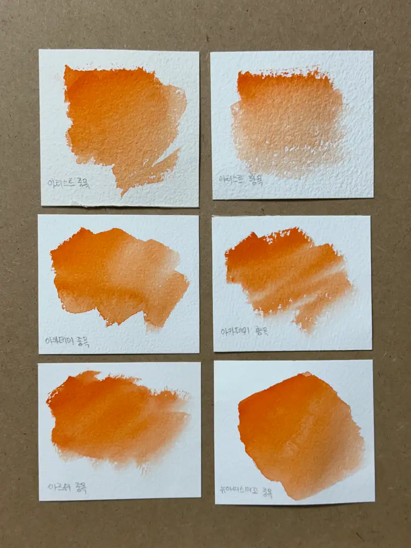 같은 황목, 중목이어도 아티스트가 종이의 질감이 더 거칠게 느껴졌어요. 그래서 아티스트 라인이 더 물 흡수율이 높아요. 여러번 덧칠하고 닦아내기를 많이 하시는 분들께 적합해요. 아카데미 라인은 아티스트 종이보다는 덜 거칠게 느껴졌어요. 그래서 펜을 사용하는 어반스케치나 색연필을 사용해서 작은 부분도 디테일하게 그리는 스타일이라면 아카데미 라인이 좋을 것 같습니다. 본인 그림 스타일에 따라 종이를 선택하면 될 것 같습니다🥰