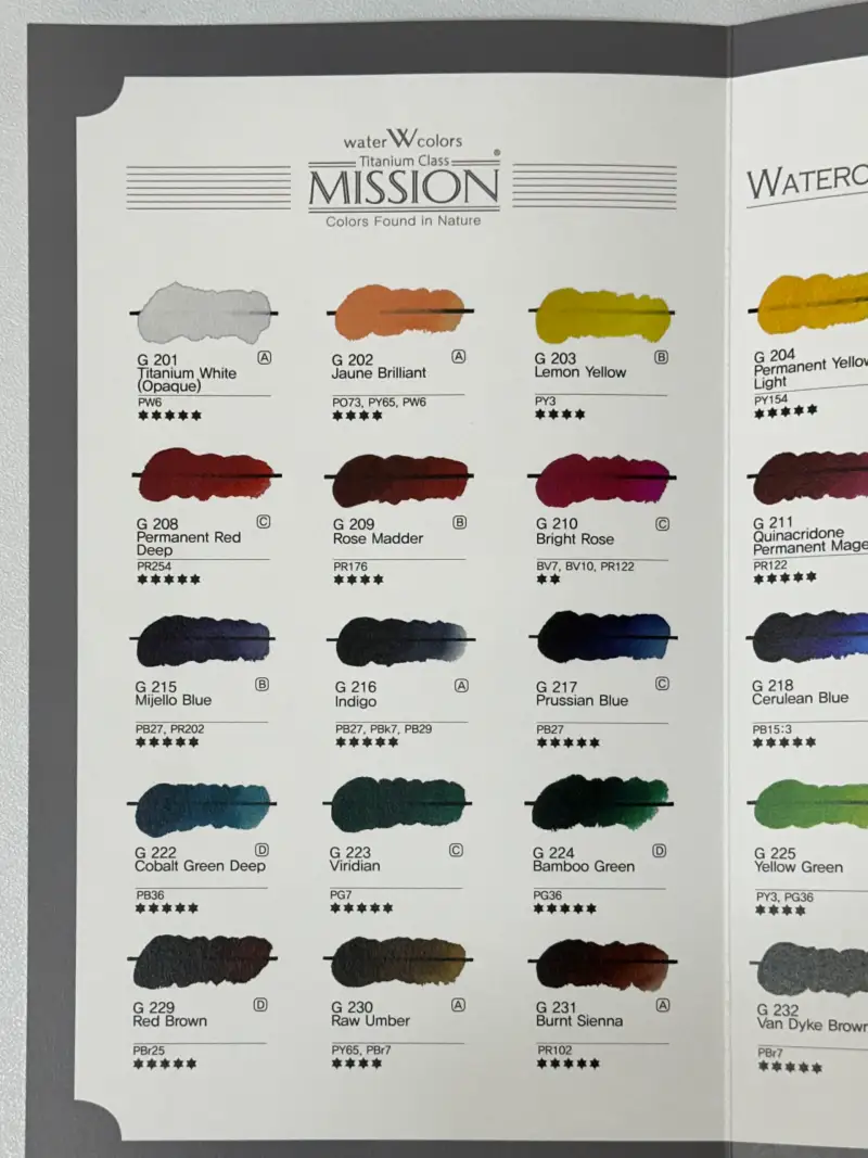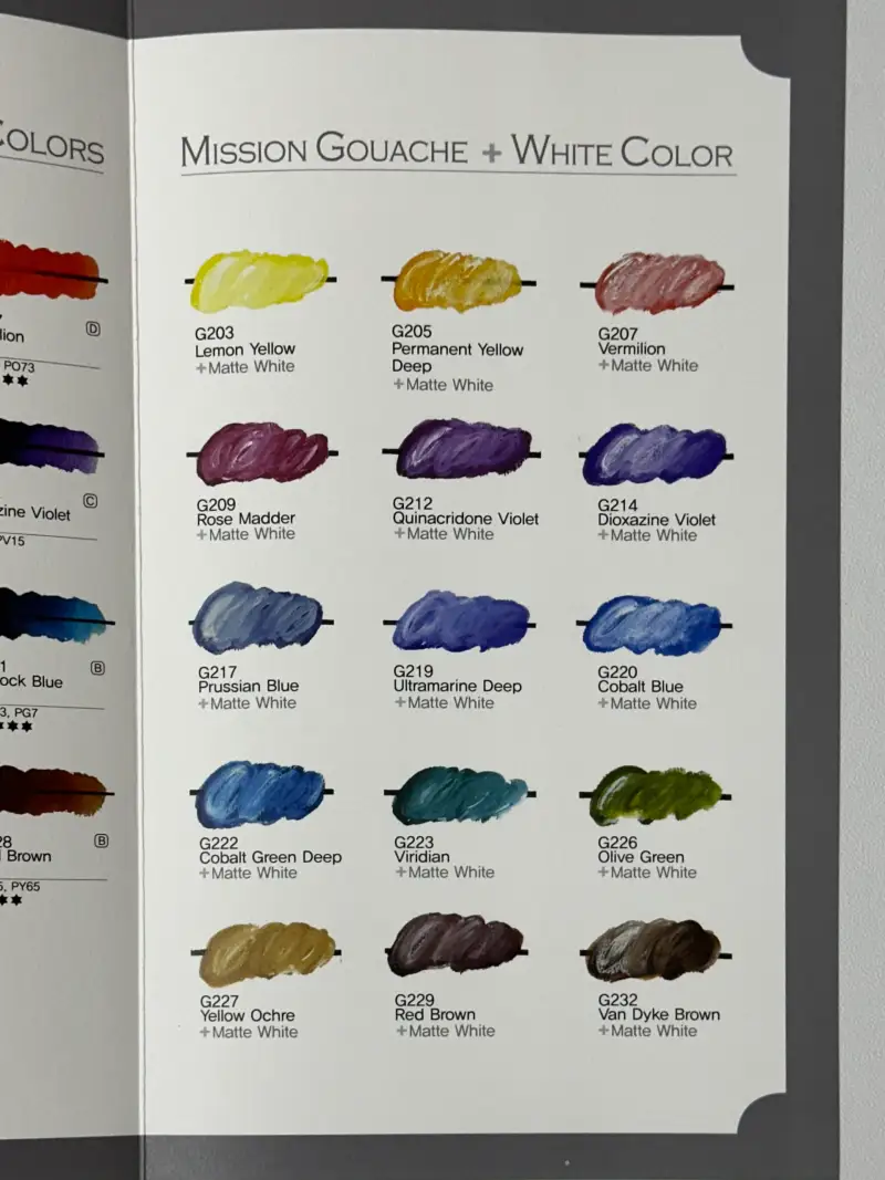 제품을 열어보면 과슈의 은폐력과 색상을 보여주는 표가 있어요. 뚜껑에도 붙어있어 좋았습니다🥹