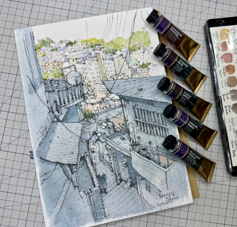 멀리 보이는 큰빌딩은 milky way violet 을 사용했는데 베이지톤에 보라가 섞여있는 느낌이에요.