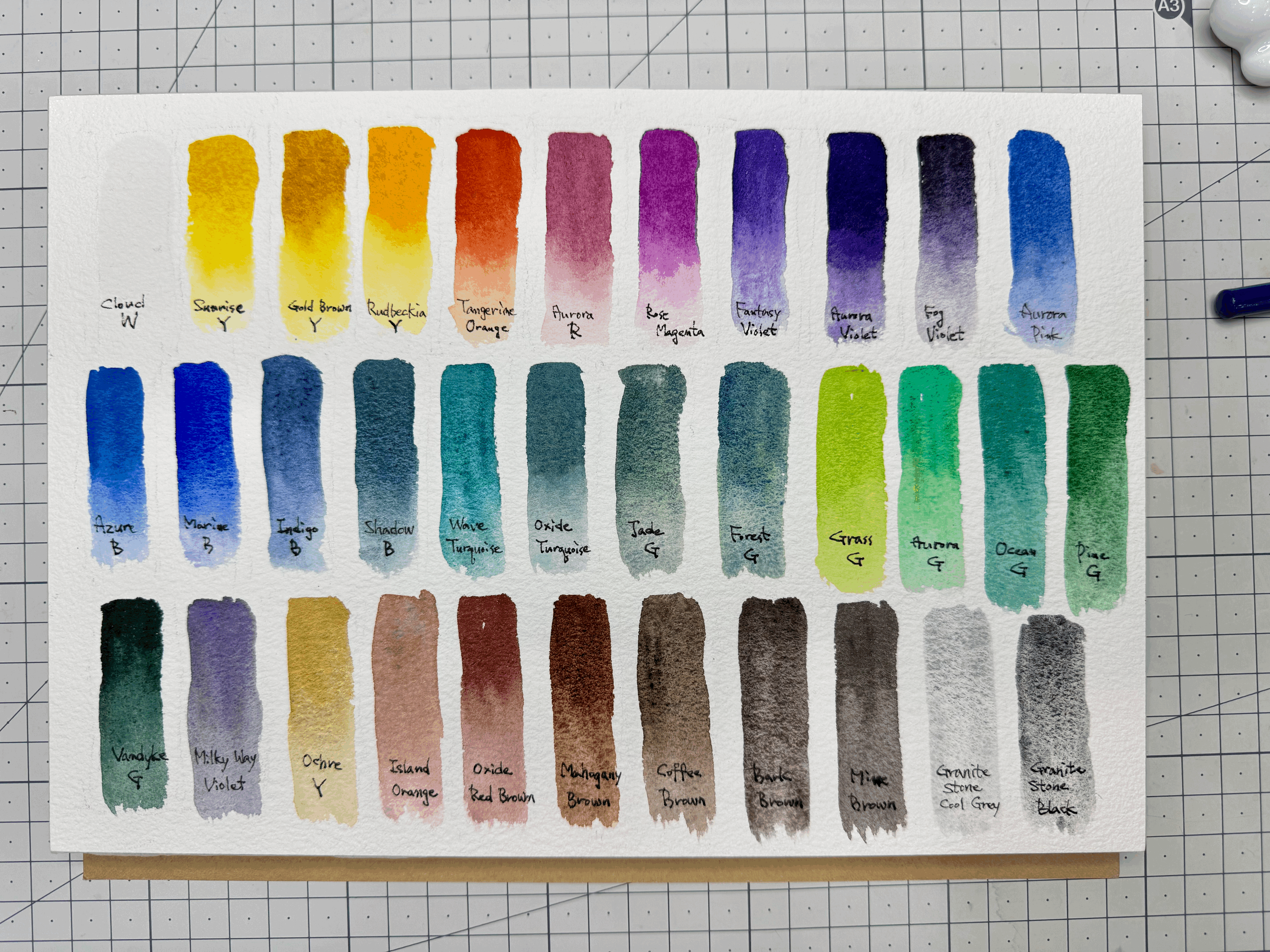 먼저 팔레트에 짜서 굳히고 발색표도 만들었는데 34가지 색감 모두가 오묘해요.