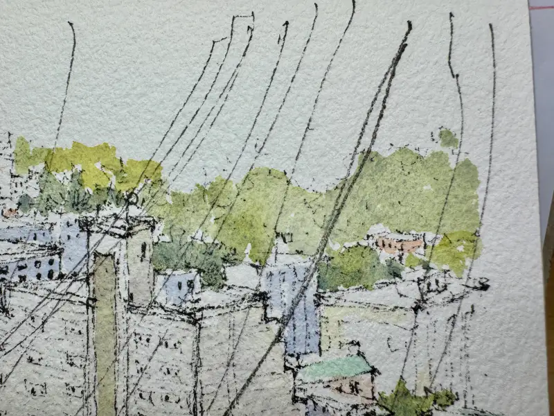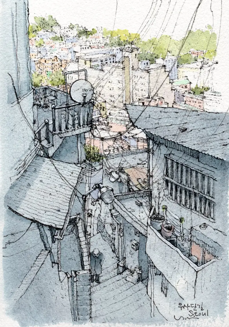 앞쪽의 근경은 푸르스름한 회색톤으로 처리하기 위해서 종이에 물을 바른 후 shadow blue를 넓게 펴발랐습니다.