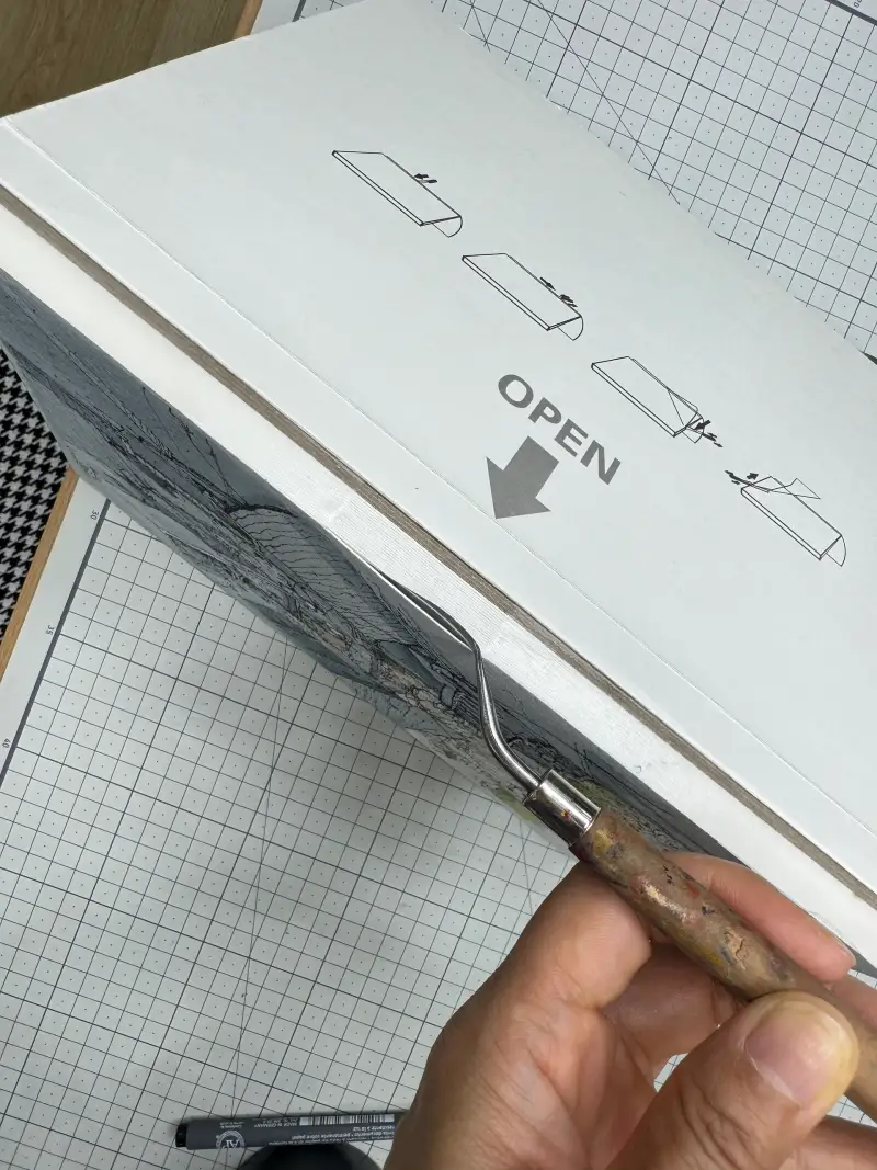 이때 종이 안쪽 open 으로 표시된 쪽에 일정부분 풀이 안 묻은 부분이 있는데 이곳에 나이프를 넣어서 조심스럽게 뜯어냅니다.