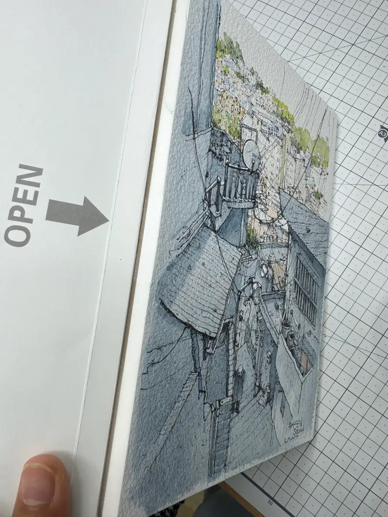 수채화는 그리는 동안 물을 많이 사용하기 때문에 종이가 많이 쭈글거리고 우는데 4면 제본이 되어있으면 마르면서 다시 반듯하게 펴집니다.