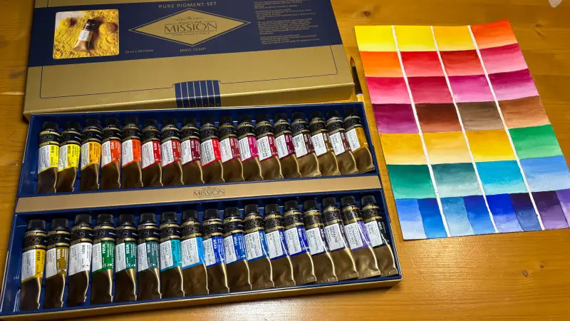 저는 개인적으로 수채화에 입문하거나 아직 조색하는 것에 익숙하지 않은 분들은 퓨어피그먼트 보다는 미션골드 34색 세트를 추천드리구여..!