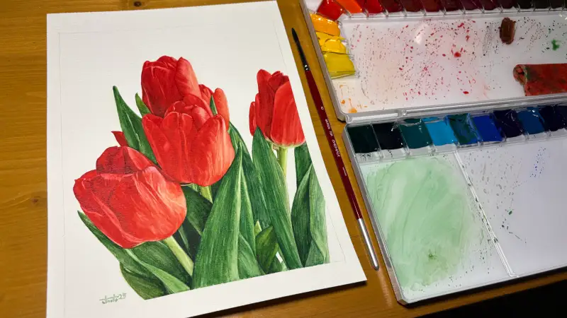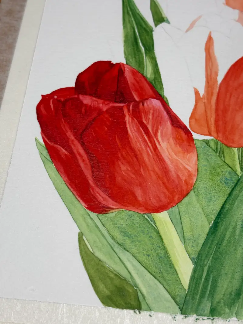 붉은 색상의 꽃이나 붉은 색의 정물이 있는 소재를 그리면 좋겠어서 고민하다가 빨간 튤립을 골라봤는데, 색감이 넘 예뻐서 결과물도 더 잘 나온 것 같아서 좋았구♡