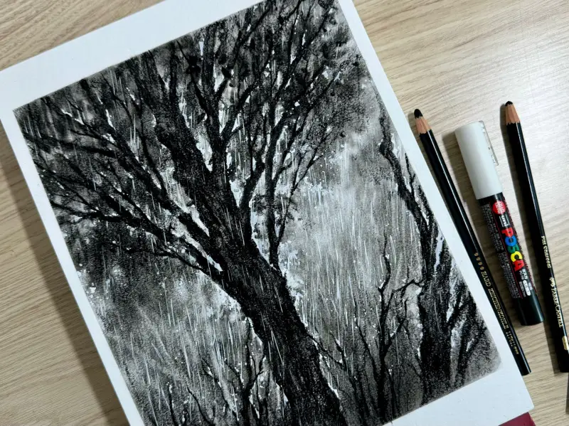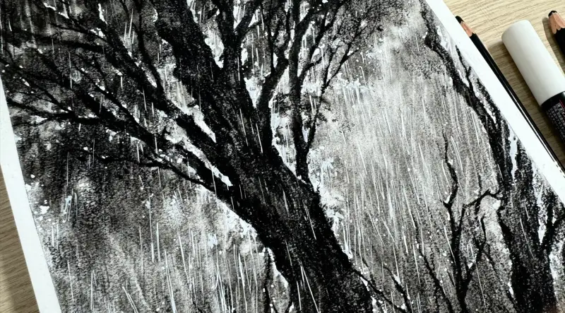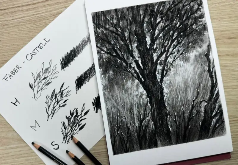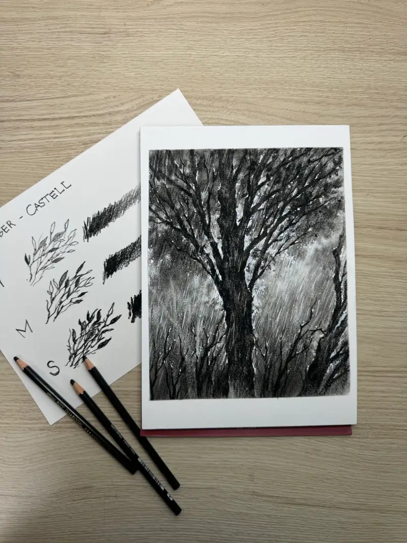 비 오는 숲속 풍경을 파버카스텔 천연 목탄연필세트로 그렸어요.