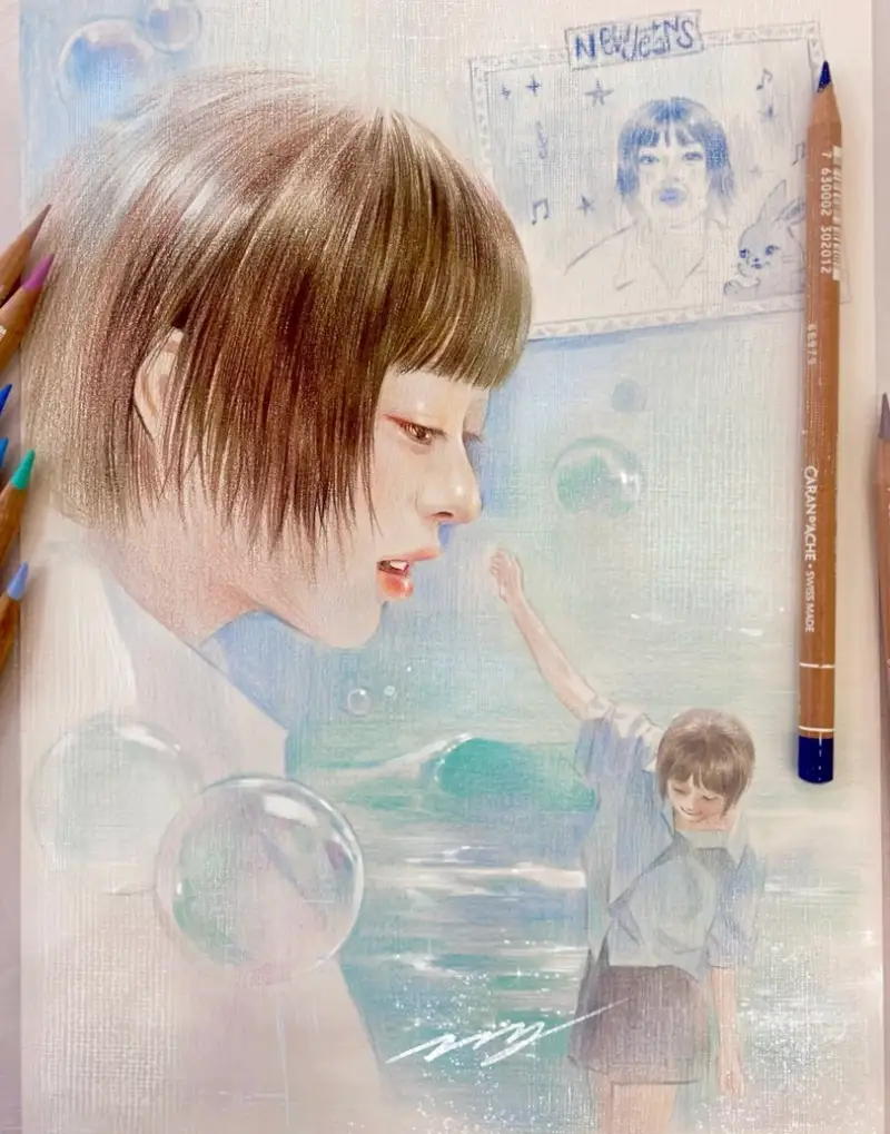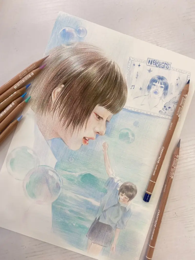 제가 평소 좋아하던 뉴진스의 하니를 일러스트화 시켜 그려봤는데요. 원하는 색감을 바로바로 찾을 수 있을만큼 여러가지 다양한 색이 폭 넓게 준비되어 있었어요. 그래서 원하는 블루 컬러와 브라운의 자연스런 그라데이션을 얻을 수 있었어요.