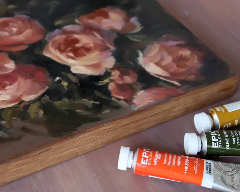 요 그림은 위와 같은 팔레트로 어두운 목재 위에 그린 장미예요. Vermilion, Cobalt Violet Light 두 가지를 메인으로 사용했어요.