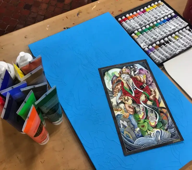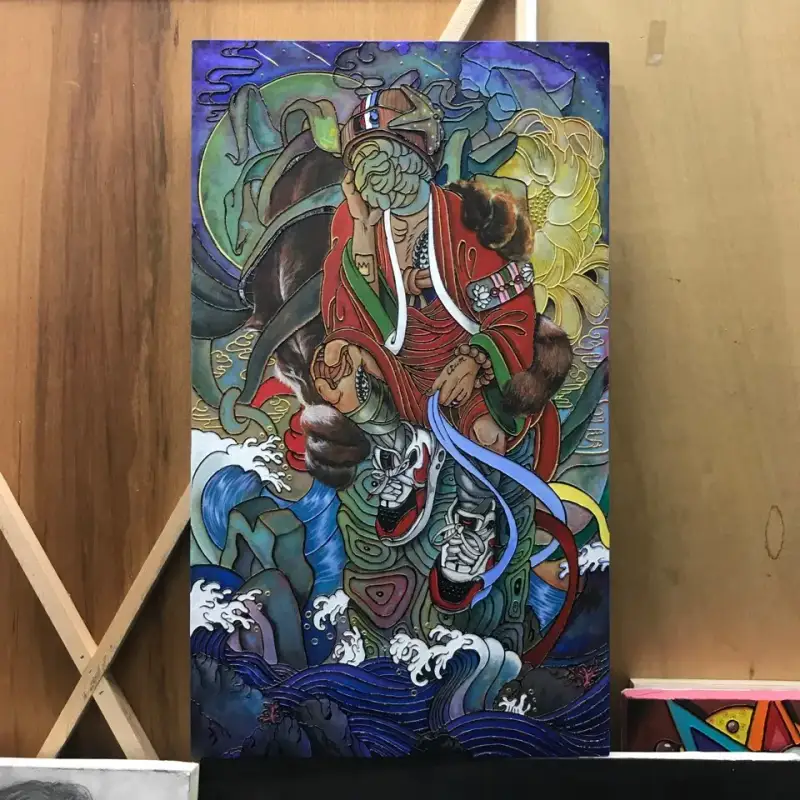 바탕지는 비단을 사용하게 되었으며 위에 블루 계열에 젯소를 사용했습니다. 형태적인 부분은 도둠기법을 사용해서 구성하게 되었습니다. 채색간 아크릴과 물에 혼합비율을 높게 하여서 수채화처럼 쌓는 방식으로 진행하게 되었습니다. 채색을 진행하면서 중간 이후부터는 아크릴만을 사용해서 밀도구성을 진행하게 되었습니다. 마무리 과정에서는 라인에 세워진 도둠에 카슈를 사용하여 완성하게 되었습니다.
