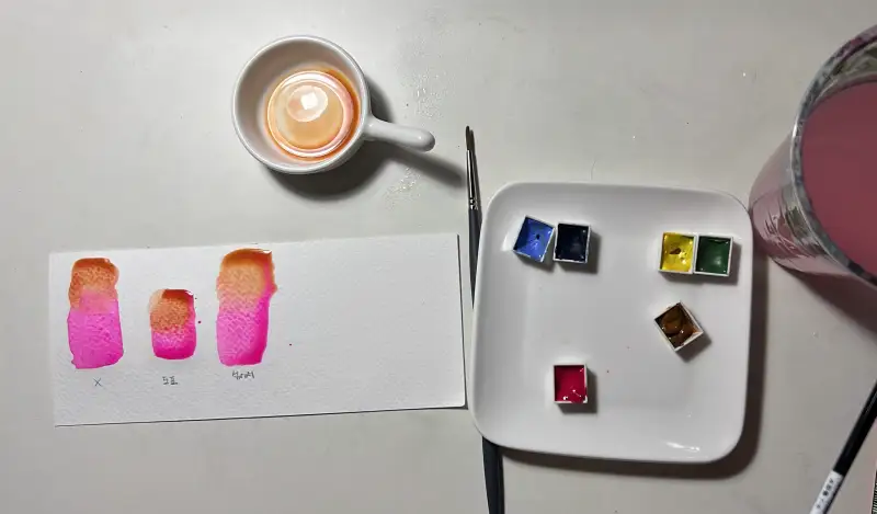 옥스겔을 도포하지 않은 곳에선 두 물감의 경계가 뚜렷하게 보이며 서로 섞이거나 하지 않는데 도포해놓고 홀린 곳에서는 그 경계가 흐려졌으며 팔레트에서 미리 물감과 섞어 칠한 것에선 완벽하게 자연스러운 그라데이션이 나왔습니다. 이렇게 알아서 번지게 해주는 종이가 아녀도 고른 발림과 자연스러운 그라데이션을 만들 수 있는 용액이 있다뇨! 물조절이 어려운 저희 학생분들에게 딱이라 생각이 들었습니다.
