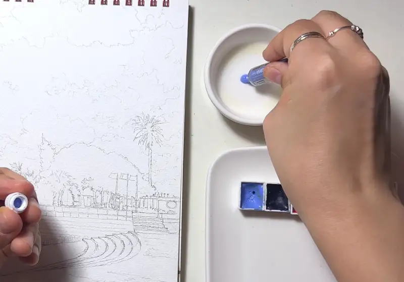 1. 팔레트에서 미리 물감과 혼합해서 쓴다.
