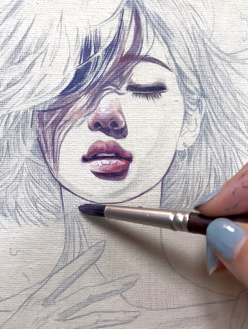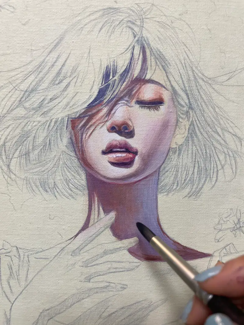 • 마지막 레이어에 **화이트(티타늄 화이트)**를 약간 섞어 뽀얀 피막을 만들어주면 연필선의 지저분함을 정리할 수 있어요.
