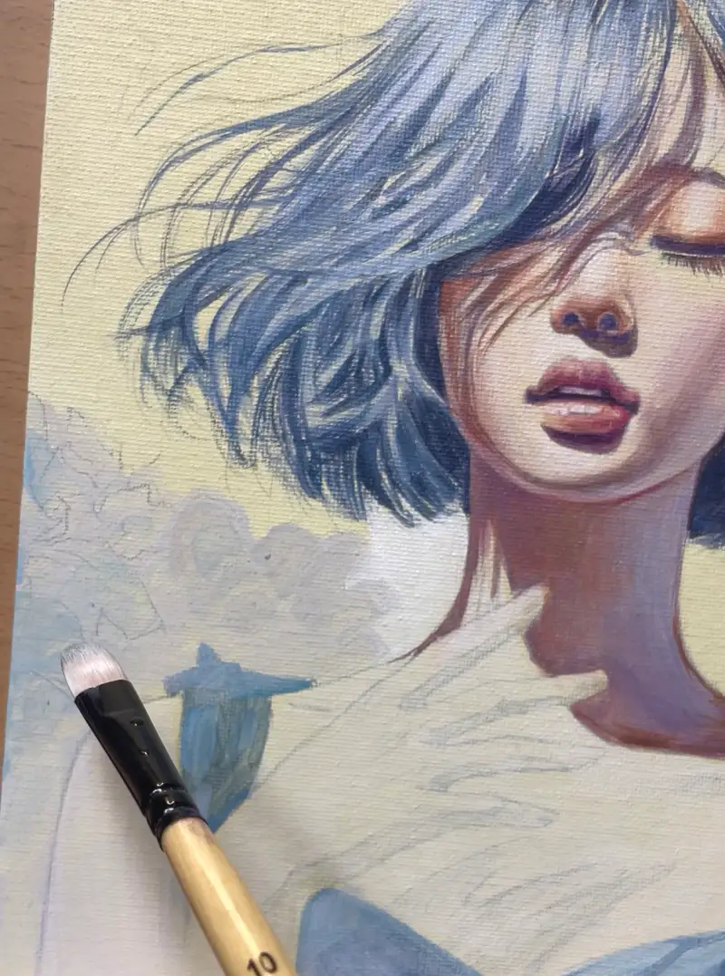 • 팁: 물감이 너무 많으면 아크릴의 빠른 건조로 번지거나 뭉침이 생김. 붓 끝에 충분히 색을 머금되, 물기는 최소화.