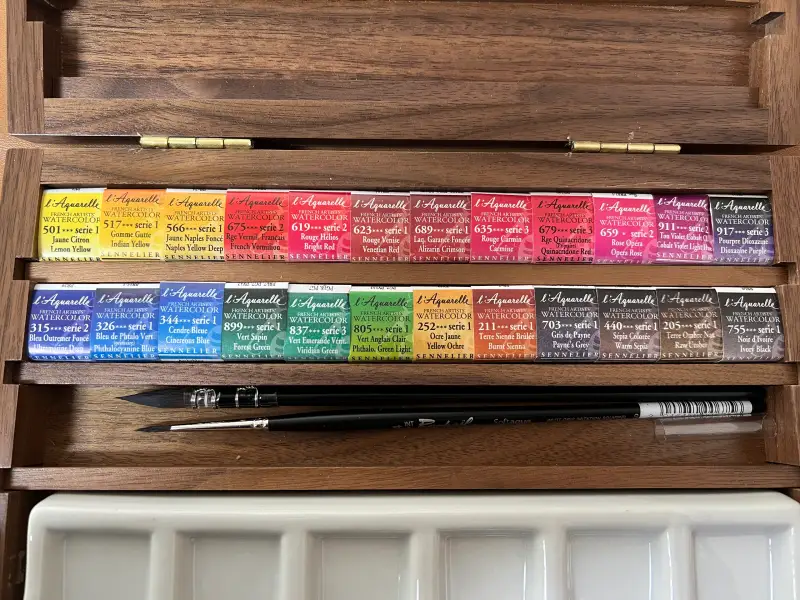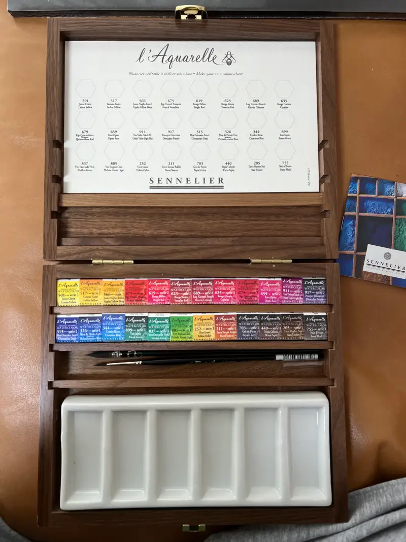 ✔️구성은 24색(하프 팬)+콜린스키 붓(라파엘 845,805)+도자기 팔레트+나무 케이스