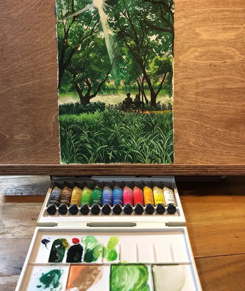 시넬리에 물감은 처음 써보는데 우선 참 맑고 가볍고 얇다였어여 일반적인 수채회들도 맑은 느낌이 있지만 이건 라이트하다란 생각이 강하게 들었어요~ 이번 그림은 숲이라 넘 가벼워 보이면 안될듯해서 여러번 겹쳐 올려 그려봤는데 다음엔 물맛느낌이 나게 가볍고 맑게 그릴 수 있는 그림이라면 어떨지 궁금해지네요~