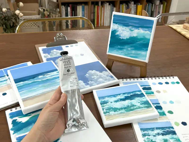 시넬리에 리브고쉬 Titanium white 유화물감으로 작은 캔버스 위에 푸른 바다와 하늘을 그려보았습니다.