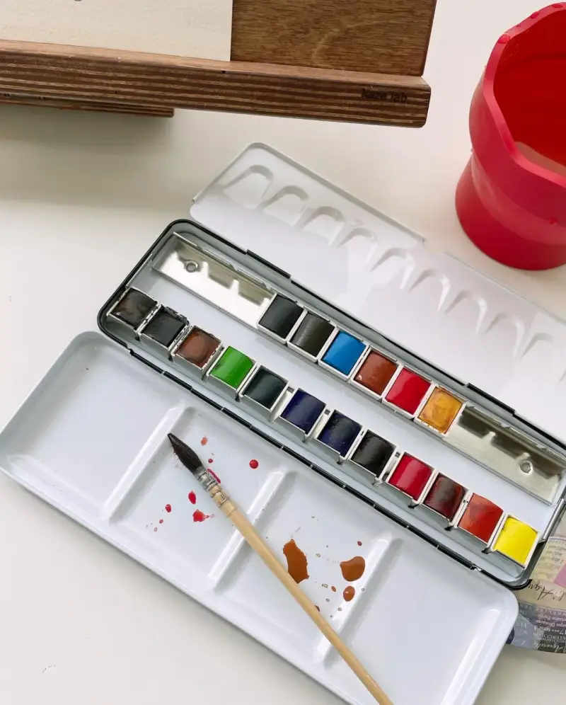 고체물감은 붓에 물을 뭍혀서 살살 문지르며 녹여서 사용하시면 되는데요.