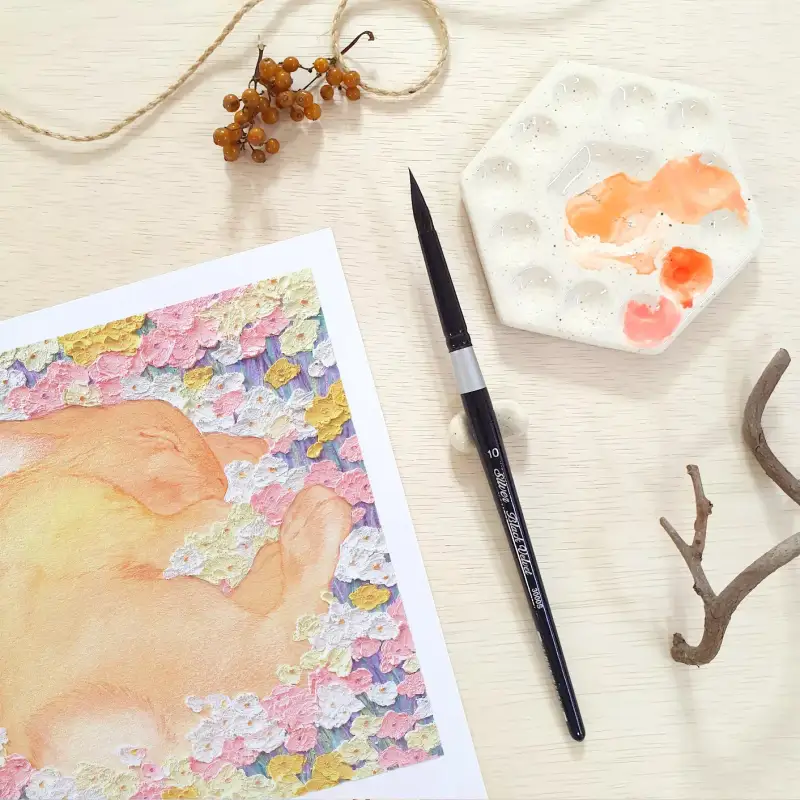 재료에서 붓을 가장 가리지 않는 편이라 특수한 효과를 필요로 할 때가 아니라면 뭐든 적당한 느낌을 선호하는데, 그런 부분에 있어서 붓모의 탄력과 물머금이 제가 표현하고자 하는 수채 작업에 탁월했어요. 물머금이 적당히 넉넉해서 일반 수채작업에 가장 걸맞을 것 같습니다.