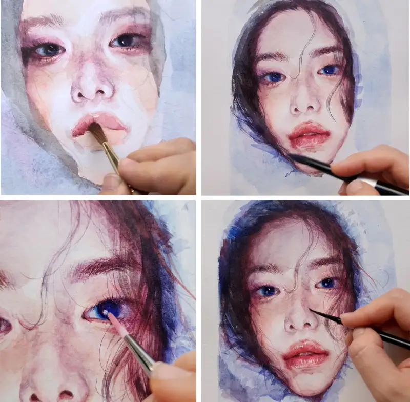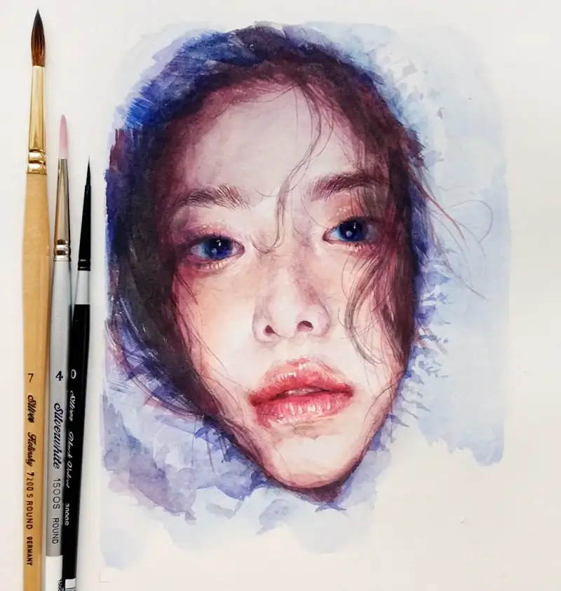 콜린스키 7호로 납작한 터치를 넣으면 회화적인 분위기를 만들 수 있어요. 이번 그림에서 가장 많이 사용한 붓이에요. 갈필을 쓰면 눈썹 묘사도 한번에 하기 좋아요. 둥근 세필을 사용해서 한올씩 그릴 수도 있지만 이런 갈필로 그리면 붓의 한가닥에서 나오는 얇은 선을 그대로 표현할 수 있어서 묘사하기 편하겠죠.