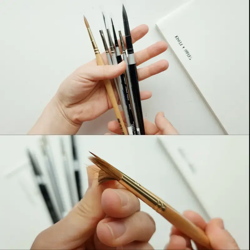 머리카락은 블랙밸벳 10호로 갈필로 그렸어요. 블랙밸벳은 콜린스키보다 끝이 뾰족해서 같은 갈필을 만들어도 더 길게 표현돼요. 더 부드럽기 때문에 털이 여러갈래도 뭉치듯 갈라지거든요. 그것을 이용해서 머리카락을 그리면 질감이 잘 드러나요.
