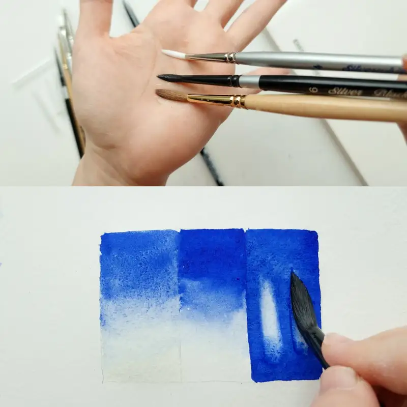 두 번째는 실버화이트 인조모 브러쉬예요. 모가 흰색으로 천연모와 인조모가 가진 장점을 합쳐 개발된 붓이에요. 천연모가 가진 높은 담수력과 털모양의 유지력이 좋아서 여러 터치를 넣을 수 있고 모양의 흐트러짐이 적어서 섬세한 표현이 가능해요.