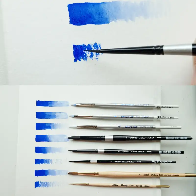 4번 실버블랙벨벳 숏트 핸들 브러쉬 3000S 라운드 Round 10호에요. 받은 붓 중 가장 도톰하고 커요. 그만금 터치의 크기가 다양해요. 담수력이 높아서 한번에 여러터치를 넣을 수 있어요. 수채화느낌을 잘 살리 수 있는 붓이에요. 물조절이 어렵다면 마른 수건을 놓고 조절하면서 쓰시면돼요.