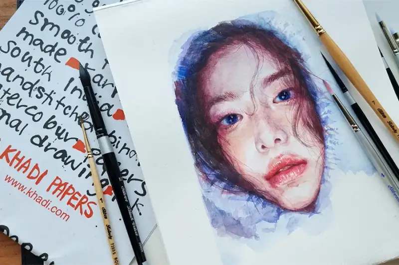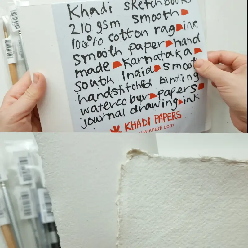 먼저 카디페이퍼라는 종이를 살펴볼게요. 카디페이퍼는 인도남부지방에서 재배된 면화를 원료로하여 전통방식으로 손으로 직접 제작하는 종이에요. 일반 종이에 비해 섬유가 길고 물에 대한 내구성이 좋아요. 수작업이다보니 거친 질감 표현이 그대로 드러나는 편이라 자연스러운 느낌과 터치감을 살리고 싶은 분들에게 추천드려요.