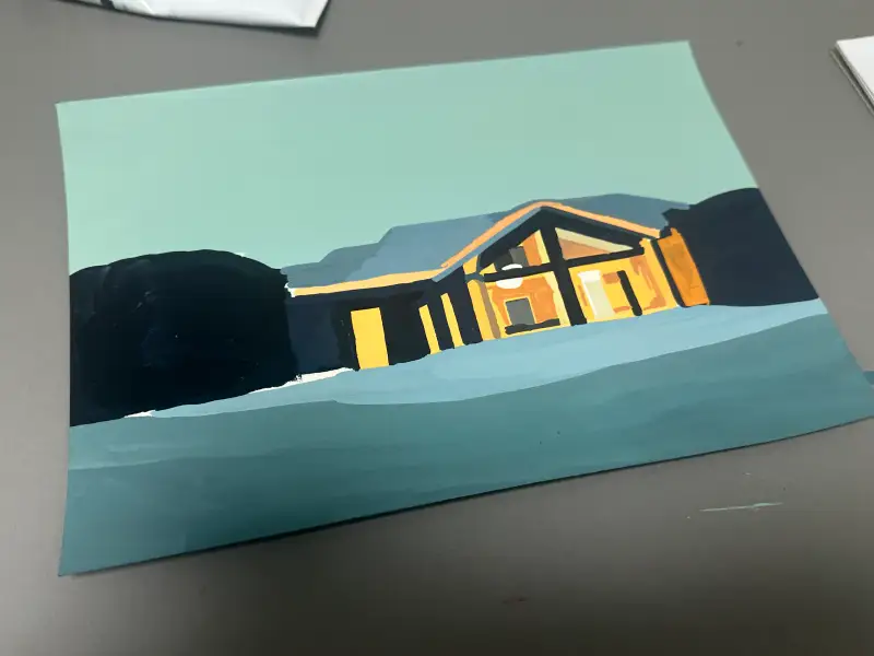 첫 단계에서는 하늘과 땅, 건물의 큰 면적을 먼저 나눠 칠했어요.
